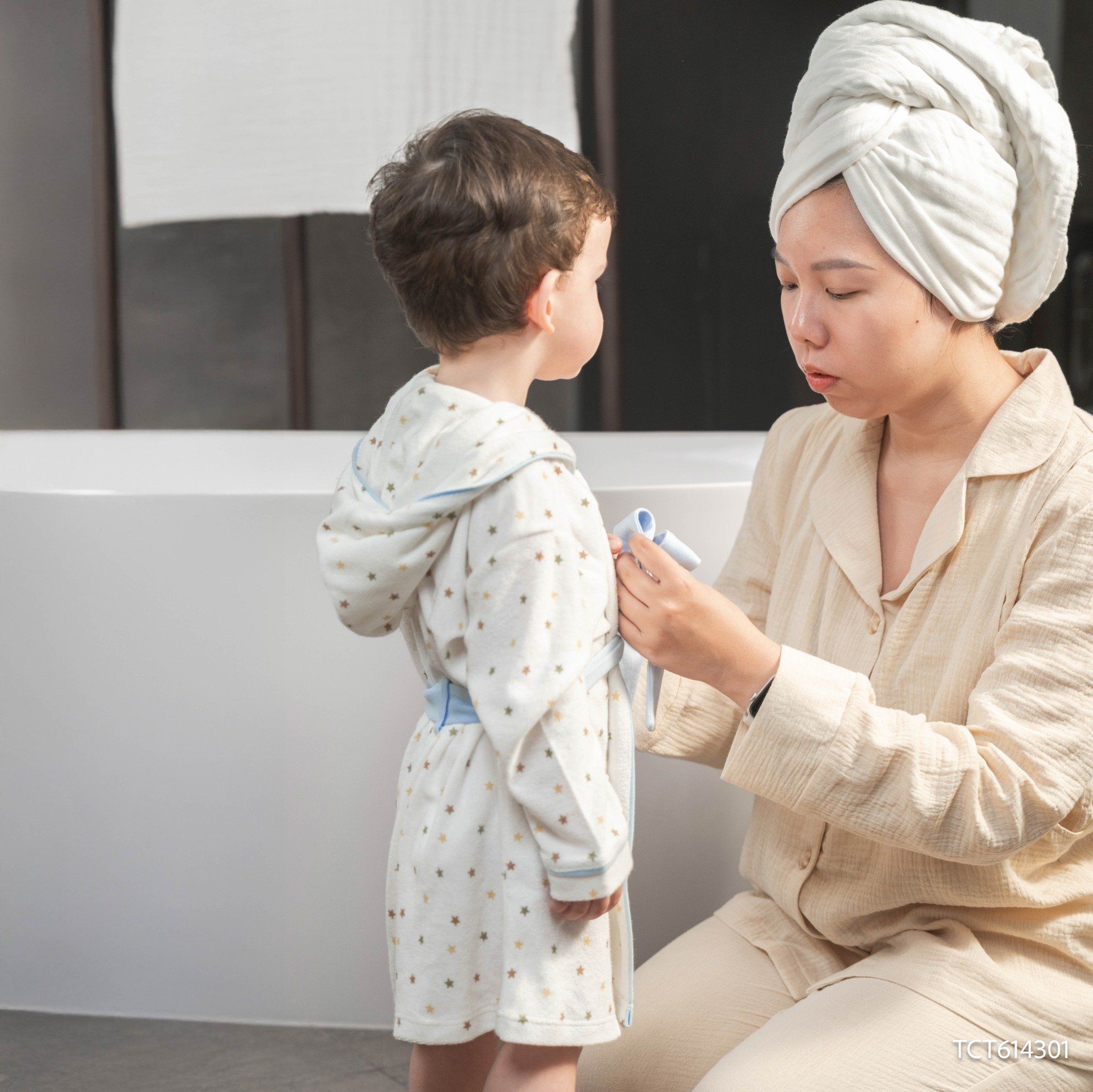 - Áo choàng tắm có mũ, buộc dây