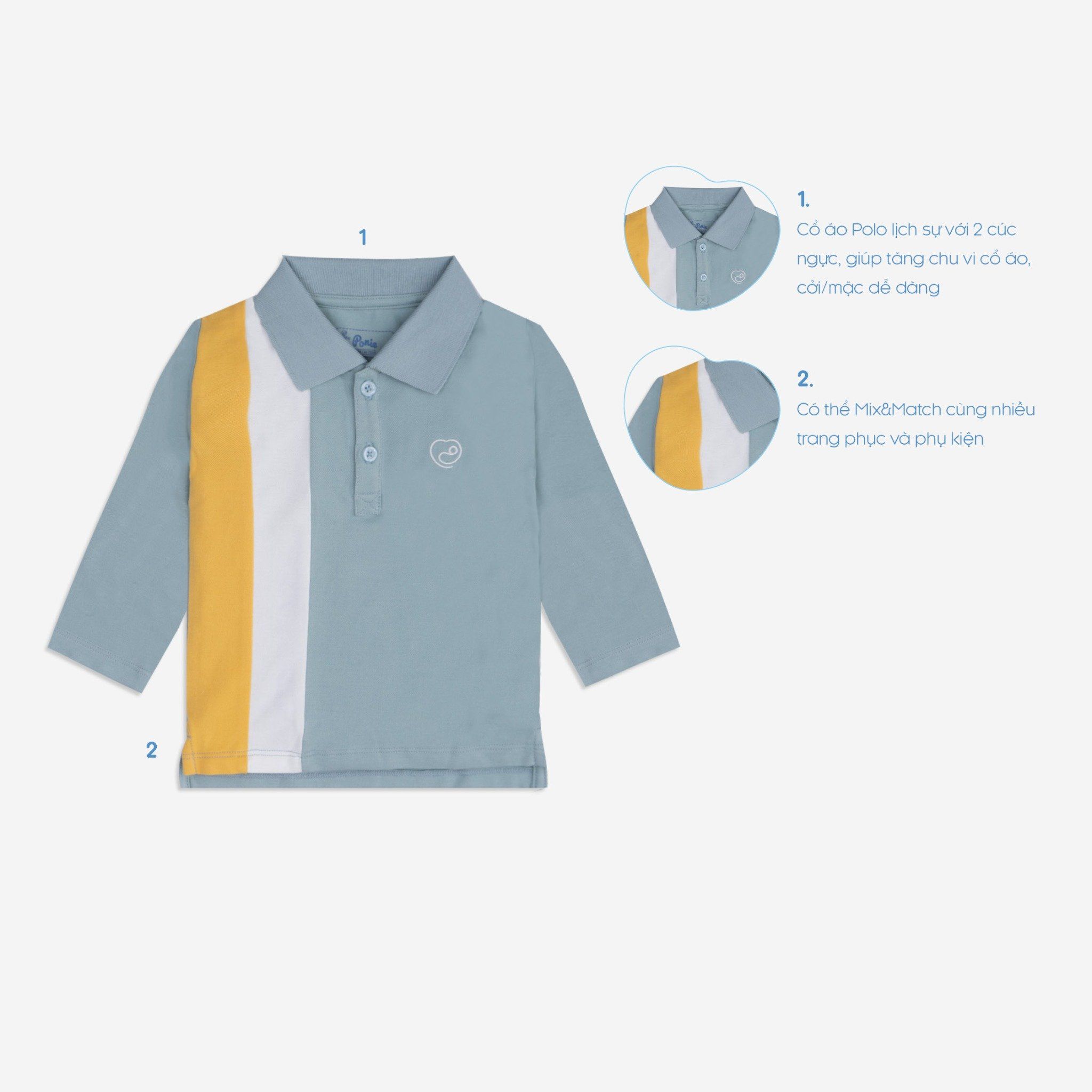 Áo dài tay Ponie là trang phục thiết yếu đối với các em bé từ 06 tháng tuổi. Thiết kế với chu vi vòng cổ có thể điều chỉnh nhờ 2 cúc trước ngực, giúp dễ dàng để mặc vào/ cởi ra, tiện lợi cho ba mẹ trong quá trình thay đồ cho bé và không khiến bé cảm thấy khó chịu. Dựa trên kiểu dáng polo truyền thống, chiếc áo mang phong cách năng động, thời trang bên cạnh sự thoải mái và ấm áp. Sản phẩm được thiết kế vừa vặn, co giãn tự nhiên, nâng niu từng cử động của bé, giúp bé luôn cảm thấy thoải mái nhất.