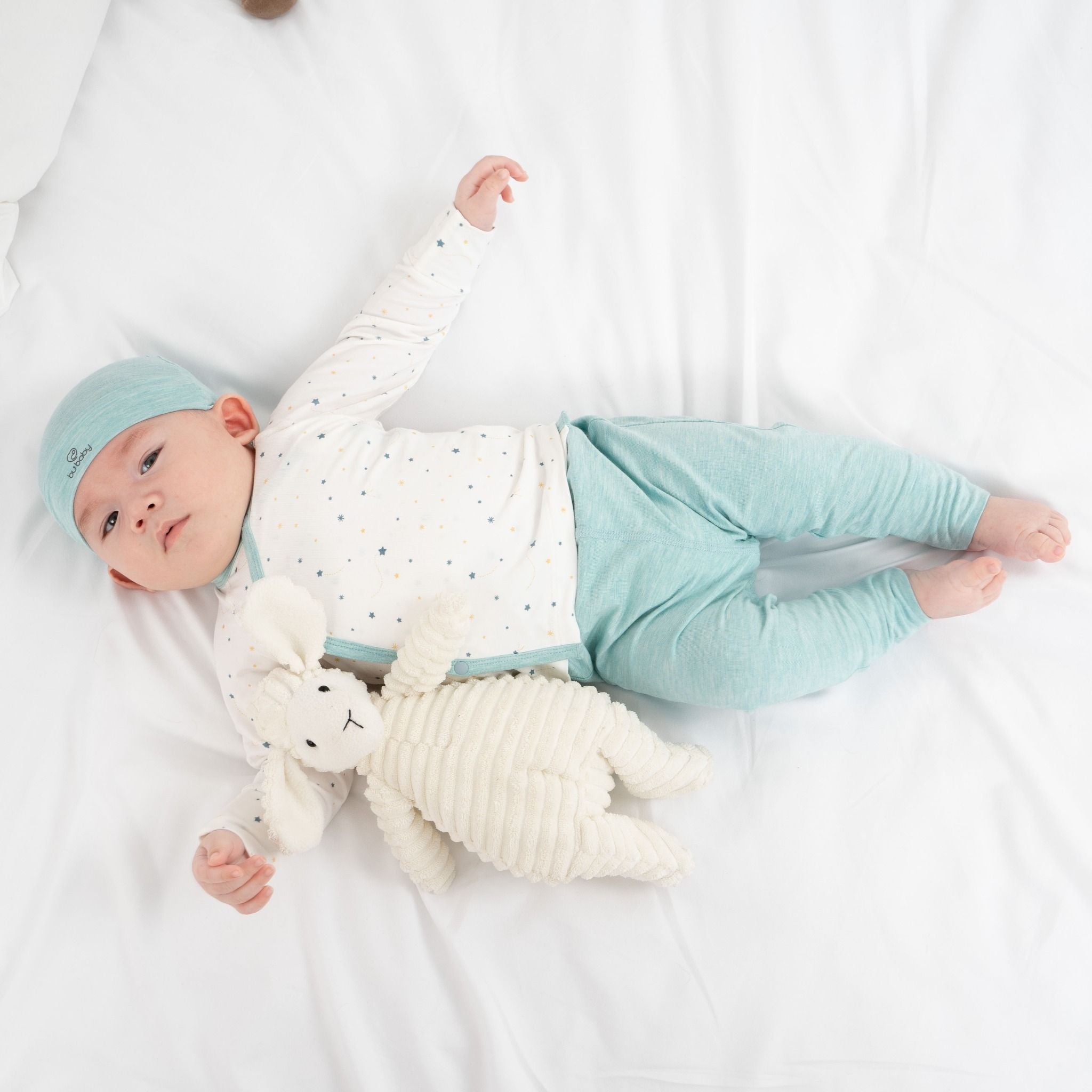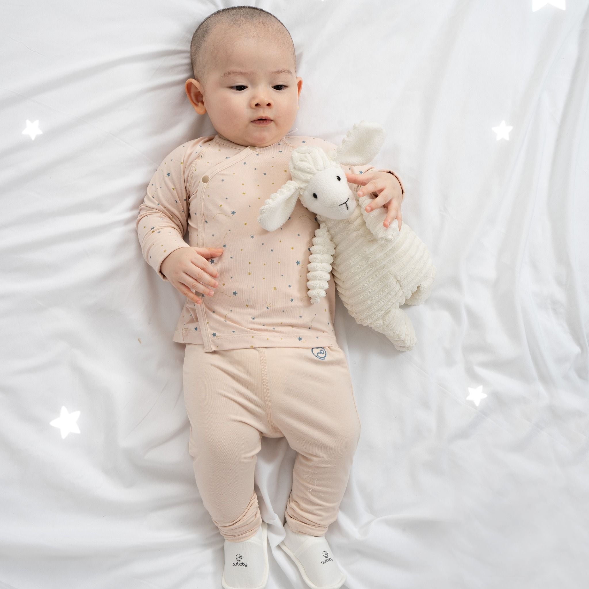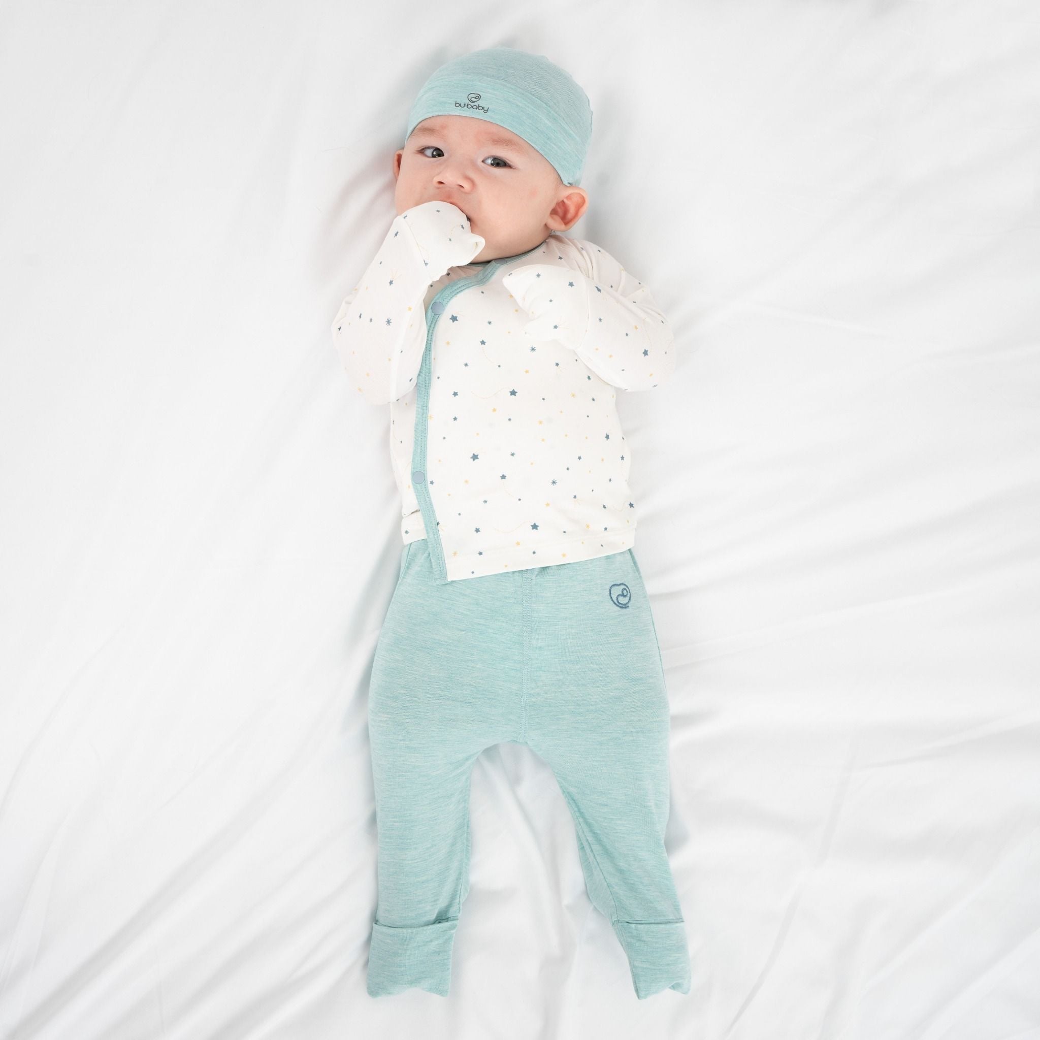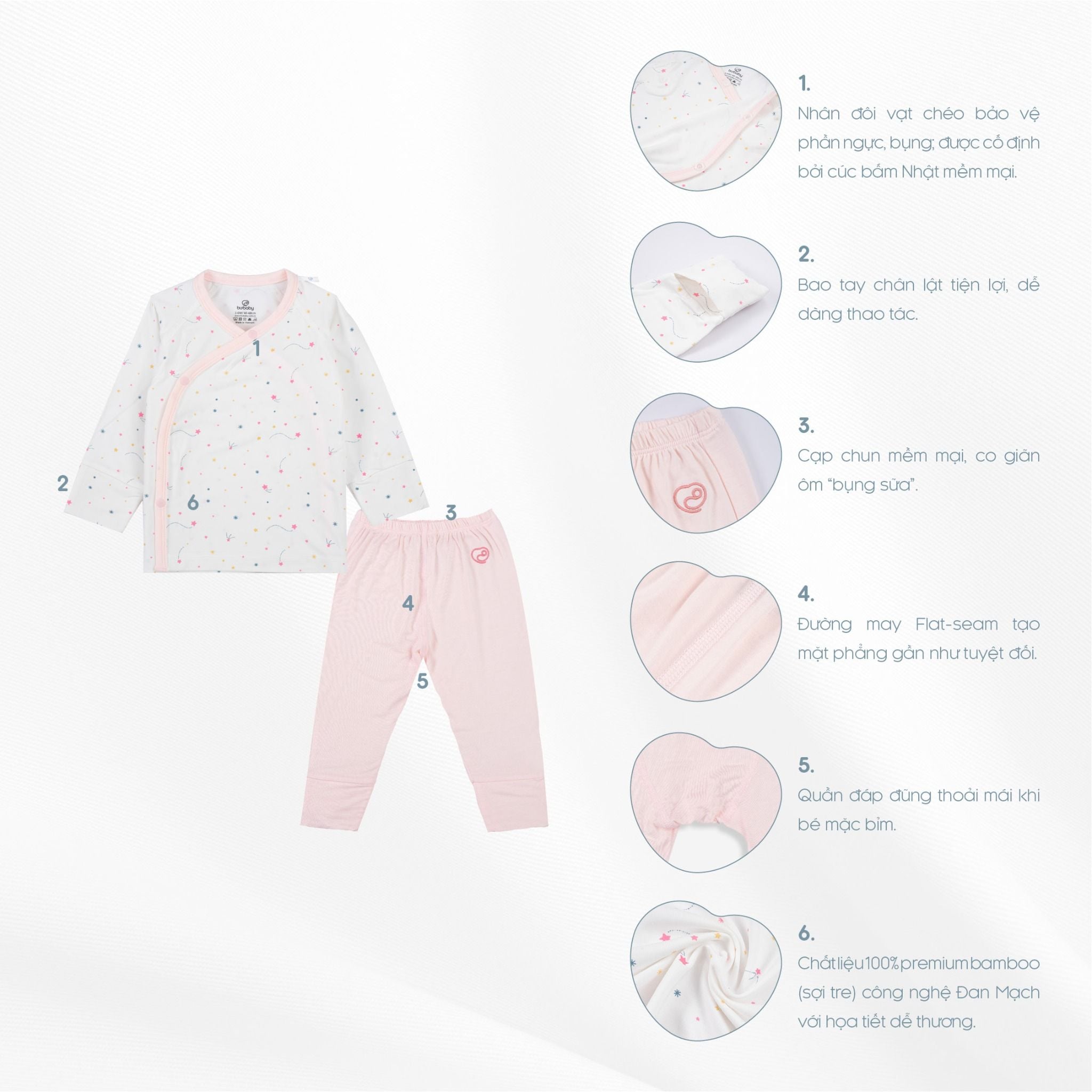 Bộ dài tay cài chéo quần dài là trang phục quan trọng nhất đối với các em bé ngay từ khi lọt lòng. Thiết kế Nhân đôi vạt chéo bảo vệ phần ngực, bụng; được cố định bởi cúc bấm Nhật mềm mại. Bao tay chân lật tiện lợi, dễ dàng thao tác. Cạp chun mềm mại, co giãn ôm "bụng sữa". Đường may flat-seam tạo mặt phẳng gần như tuyệt đối, tránh cọ xát. Quần đáp đũng thoải mái khi bé mặc bỉm. Chất liệu 100% premium bamboo (sợi tre) công nghệ Đan Mạch.