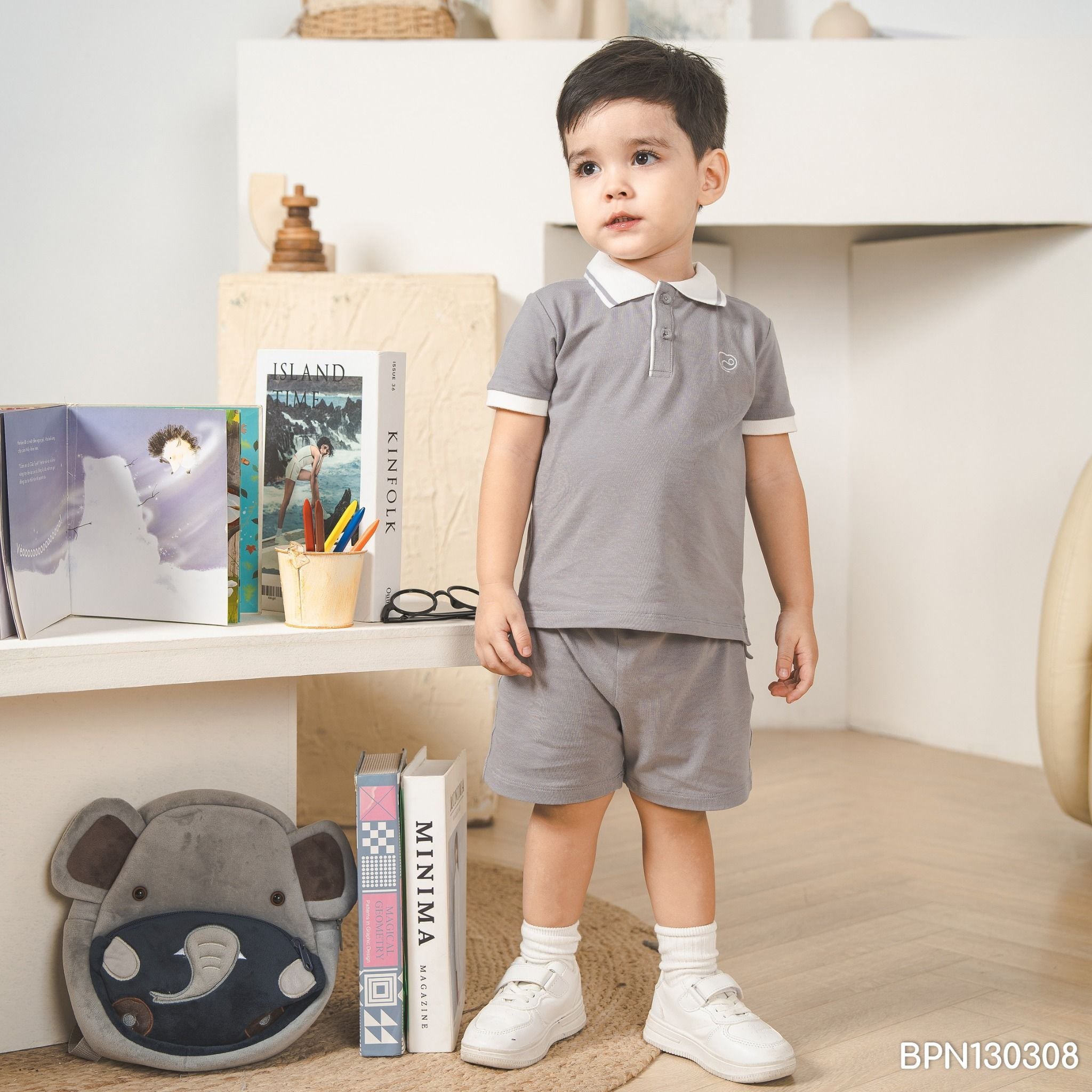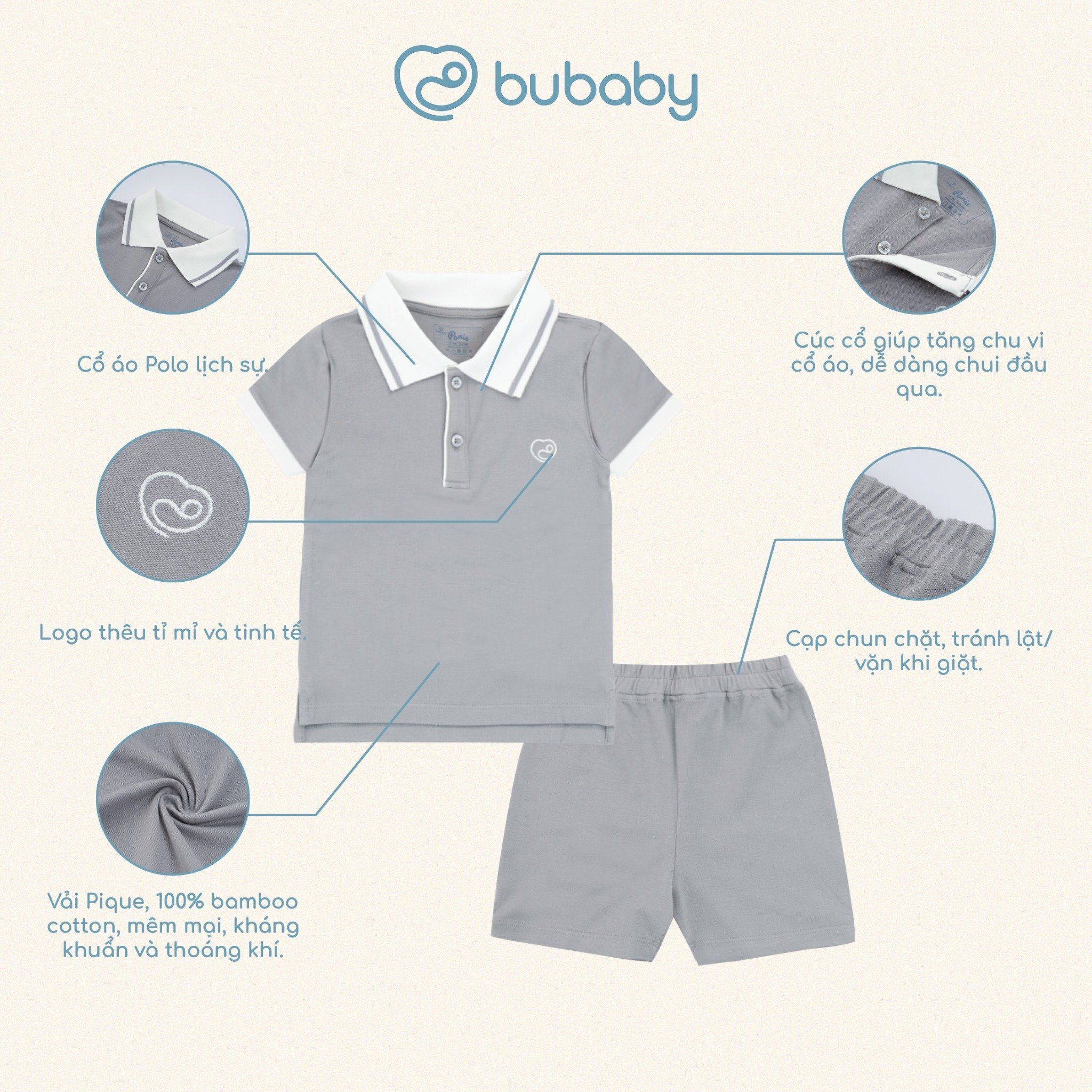 Bộ cộc là trang phục thiết yếu đối với các em bé từ 06 tháng tuổi. Cổ áo polo lịch sự được phối màu tạo điểm nhấn. Hai nấc cúc ngực cởi/mặc dễ dàng. Xẻ nhẹ ở tà áo tạo điểm nhấn thời trang. Cạp chun may chặn giữa, tránh lật/vặn khi giặt. Chất liệu kết hợp giữa sợi tre cao cấp (premium bamboo) và sợi bông hữu cơ tinh khiết.