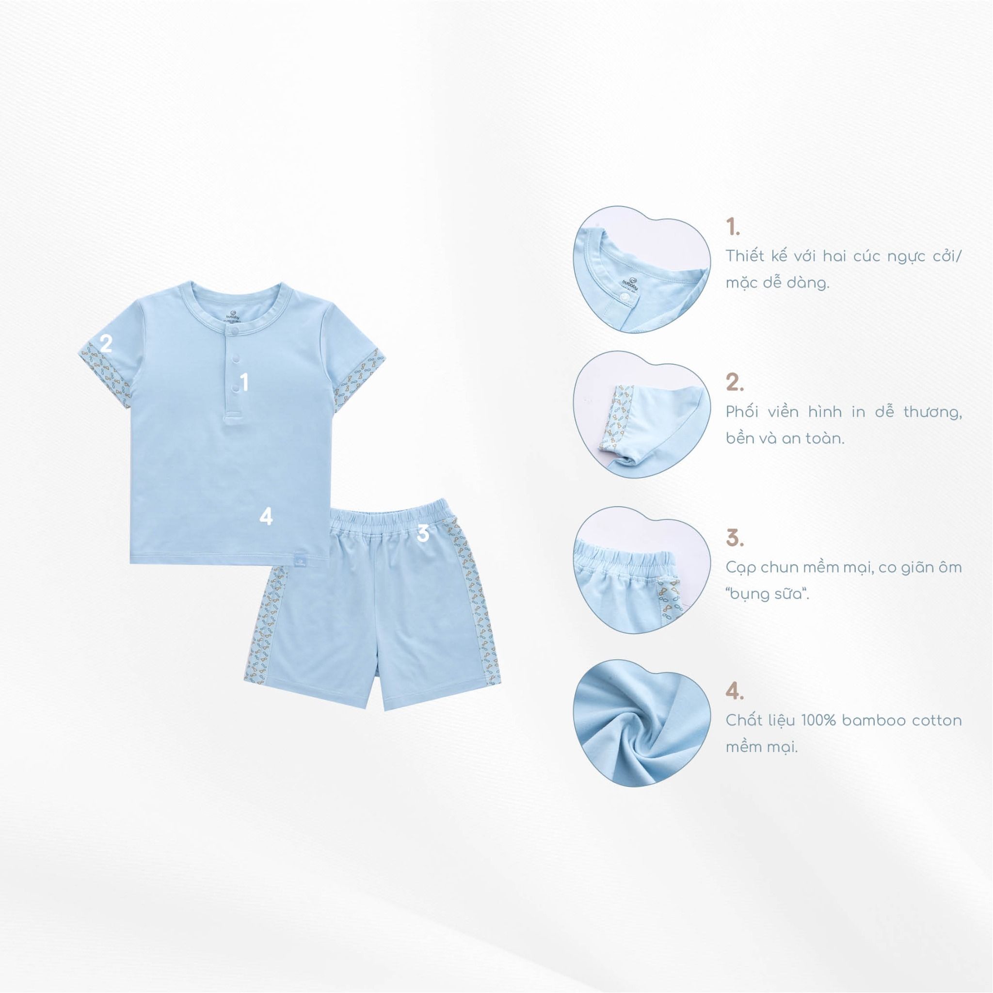 Chất liệu BU Kyomi là sự kết hợp giữa Bambus và Cotton, giúp giữ được những ưu điểm của vải sợi tre: mềm mại, kháng khuẩn, thân thiện với làn da nhạy cảm và có cả độ bền của sợi bông cotton. Sản phẩm của BU Baby tuyệt đối an toàn với trẻ nhỏ và thân thiện với môi trường. Sản phẩm đạt chứng nhận EOKO-TEX 100 (Class 1).