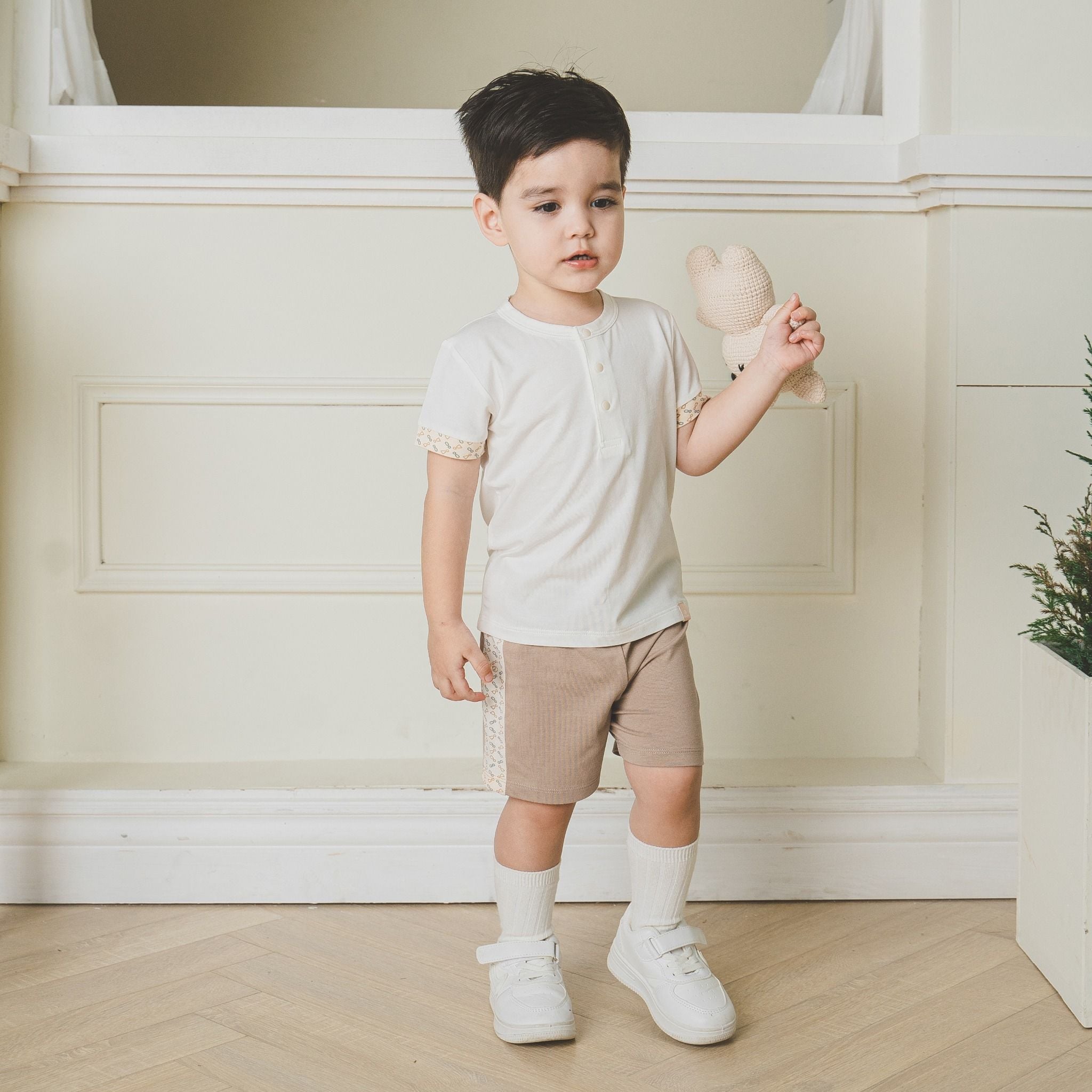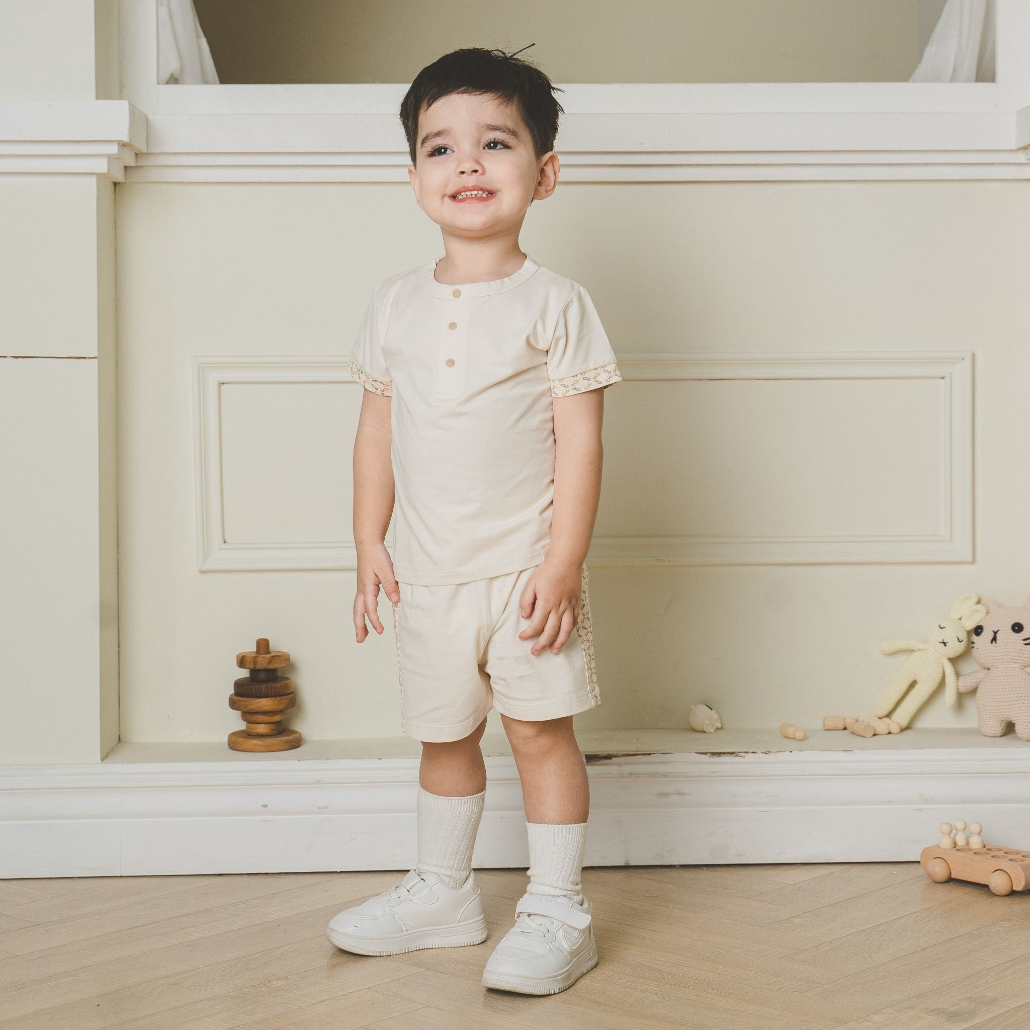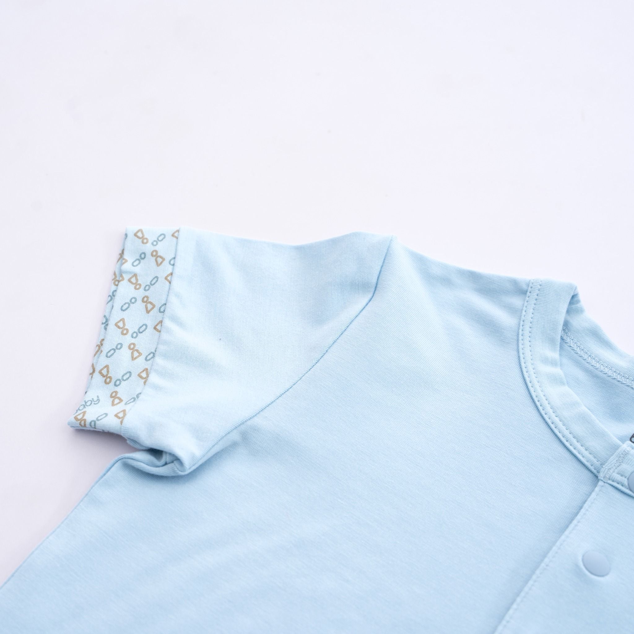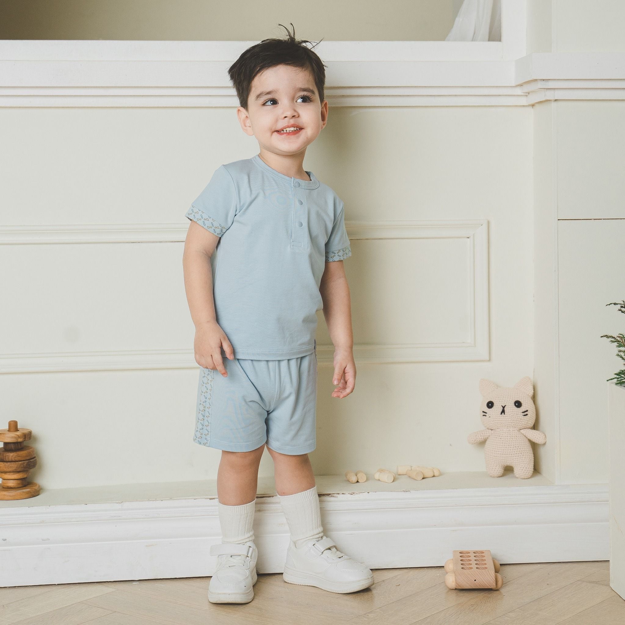 Bộ ngắn tay cổ trụ Kyomi với thiết kế hai cúc ngực cởi/mặc dễ dàng. Phối viền hình in dễ thương, bền và an toan. Cạp chung mềm mại, co giãn ôm "bụng sữa". Chất liệu 100% bamboo cotton mềm mại.