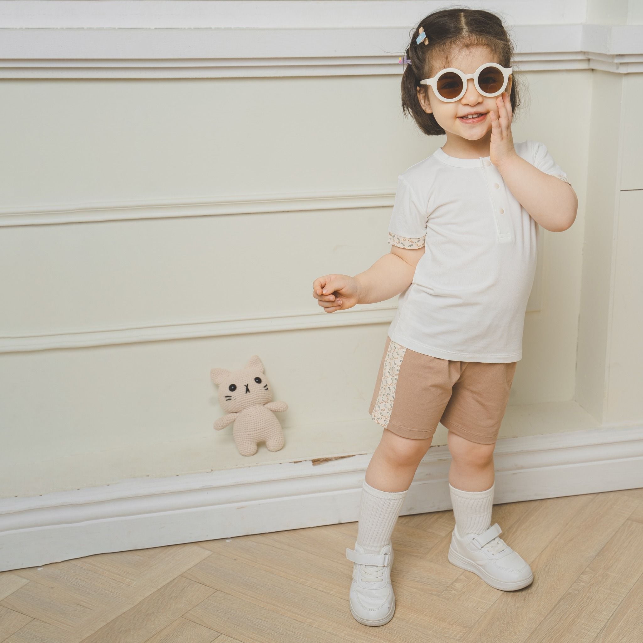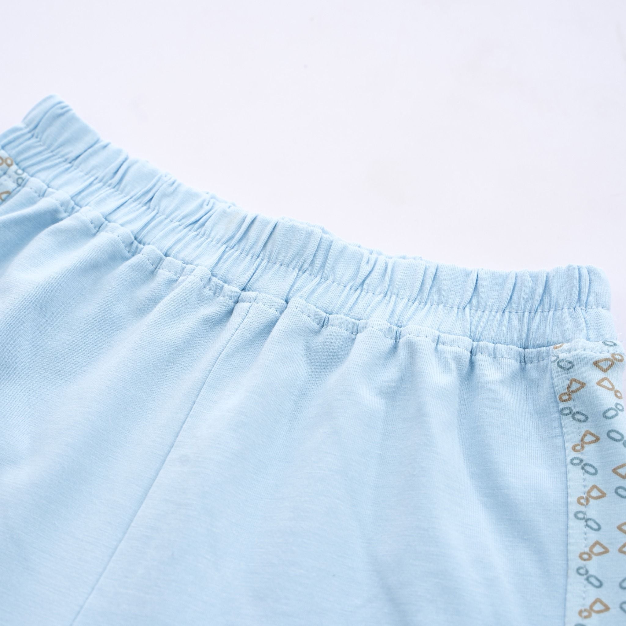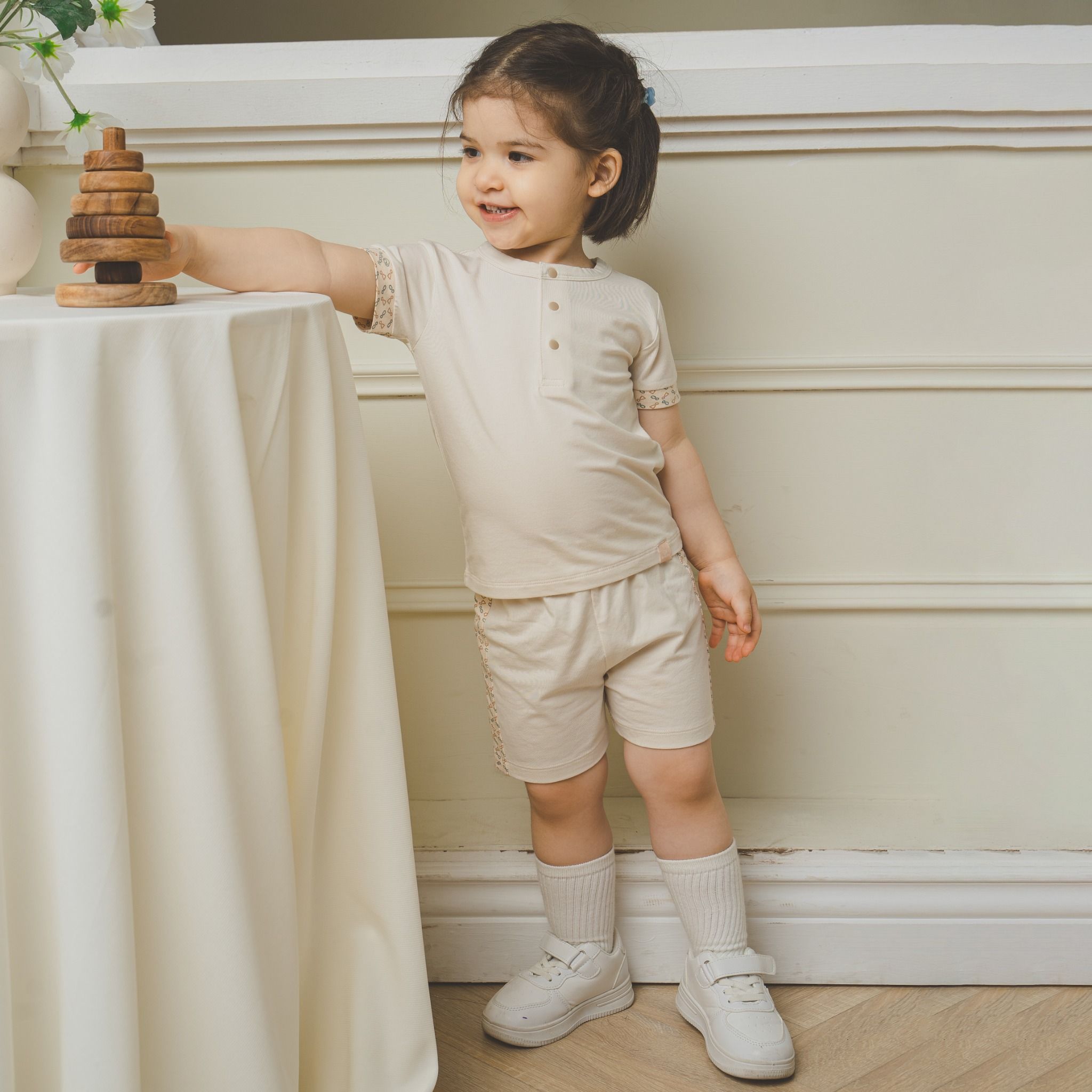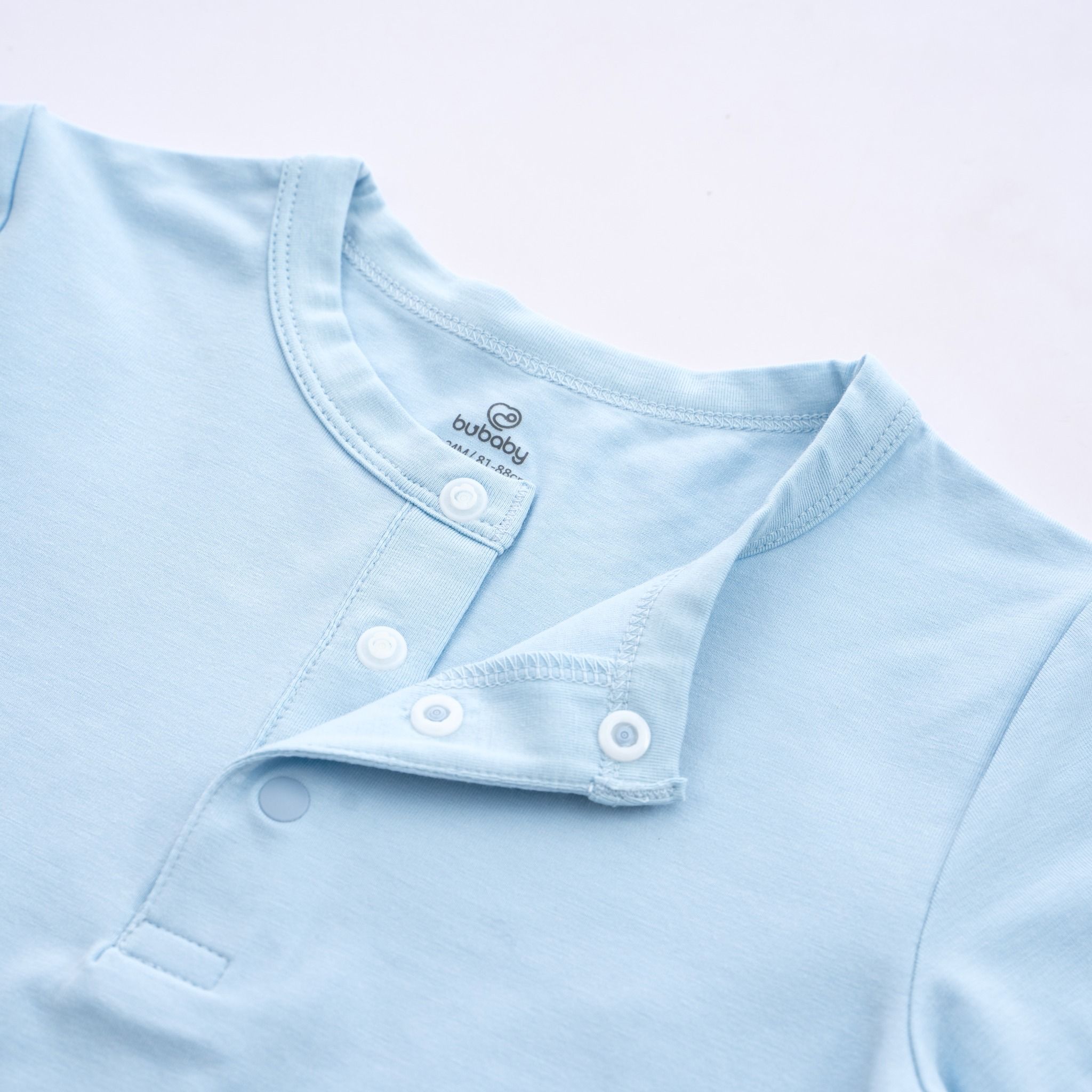 Bộ ngắn tay cổ trụ Kyomi với thiết kế hai cúc ngực cởi/mặc dễ dàng. Phối viền hình in dễ thương, bền và an toan. Cạp chung mềm mại, co giãn ôm "bụng sữa". Chất liệu 100% bamboo cotton mềm mại.