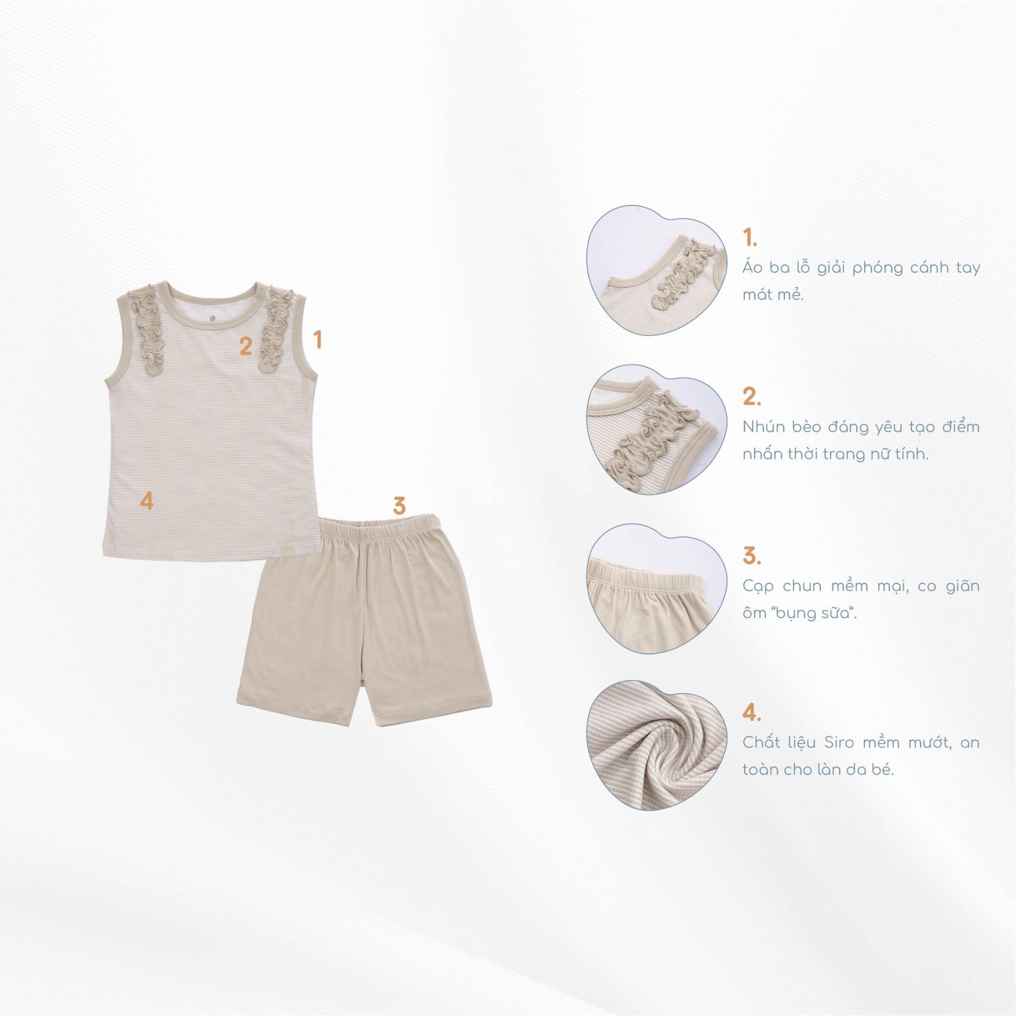 BU Siro được kết hợp tinh tế từ các sợi tự nhiên an toàn cho làn da và thân thiện với môi trường, sử dụng công nghệ dệt hiện đại nhất để tạo ra chất liệu dành riêng cho làn da non nớt và nhạy cảm của trẻ nhỏ.
