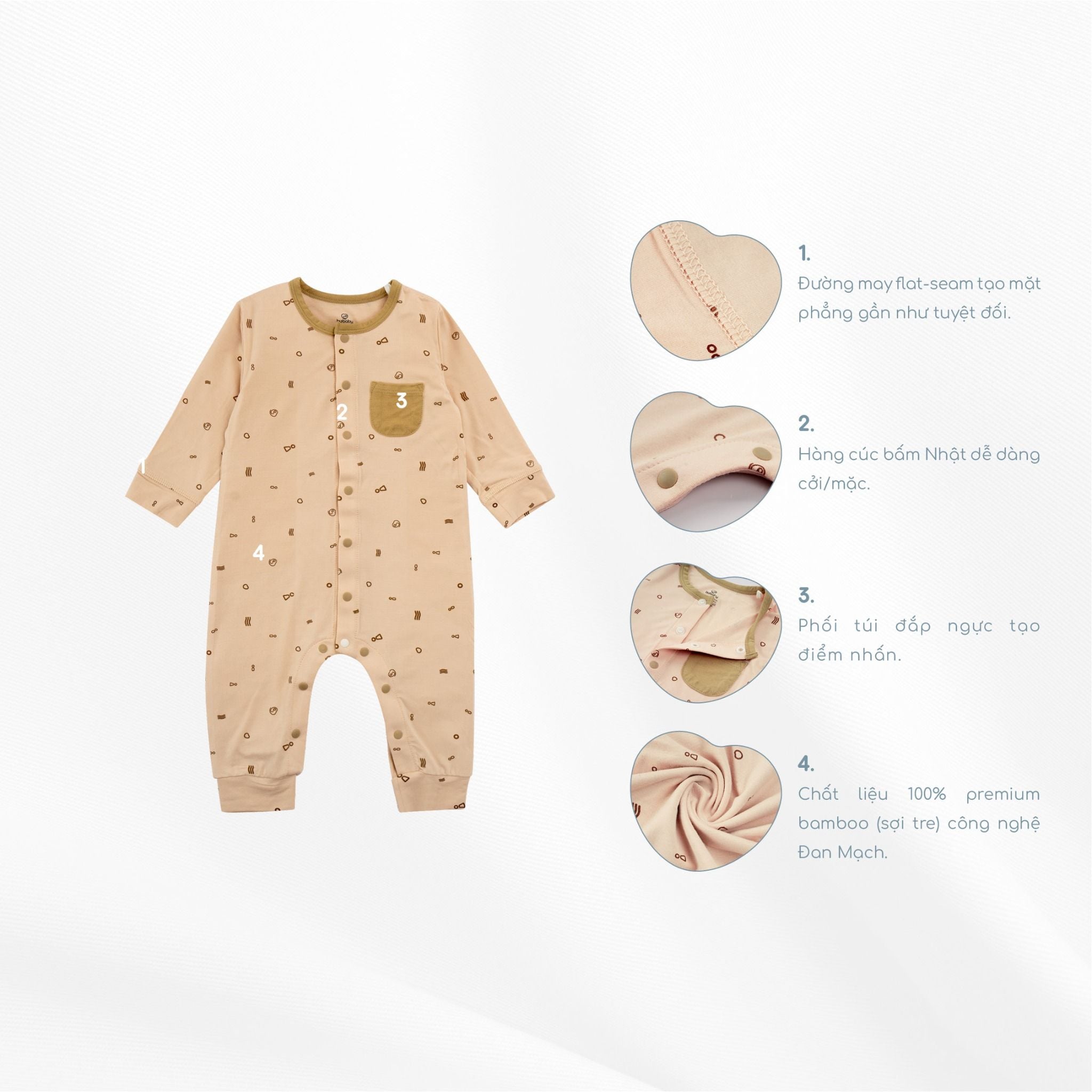 Bộ body dài tay là trang phục thiết yếu đối với các em bé ngay từ khi lọt lòng. Đường may flat-seam tạo mặt phẳng gần như tuyệt đối. Hàng cúc bấm Nhật dễ dàng cởi/mặc. Phối túi đắp ngực tạo điểm nhấn. Bo ống tay/chân hạn chế xô lệch. Chất liệu 100% premium bamboo (sợi tre) công nghệ Đan Mạch.