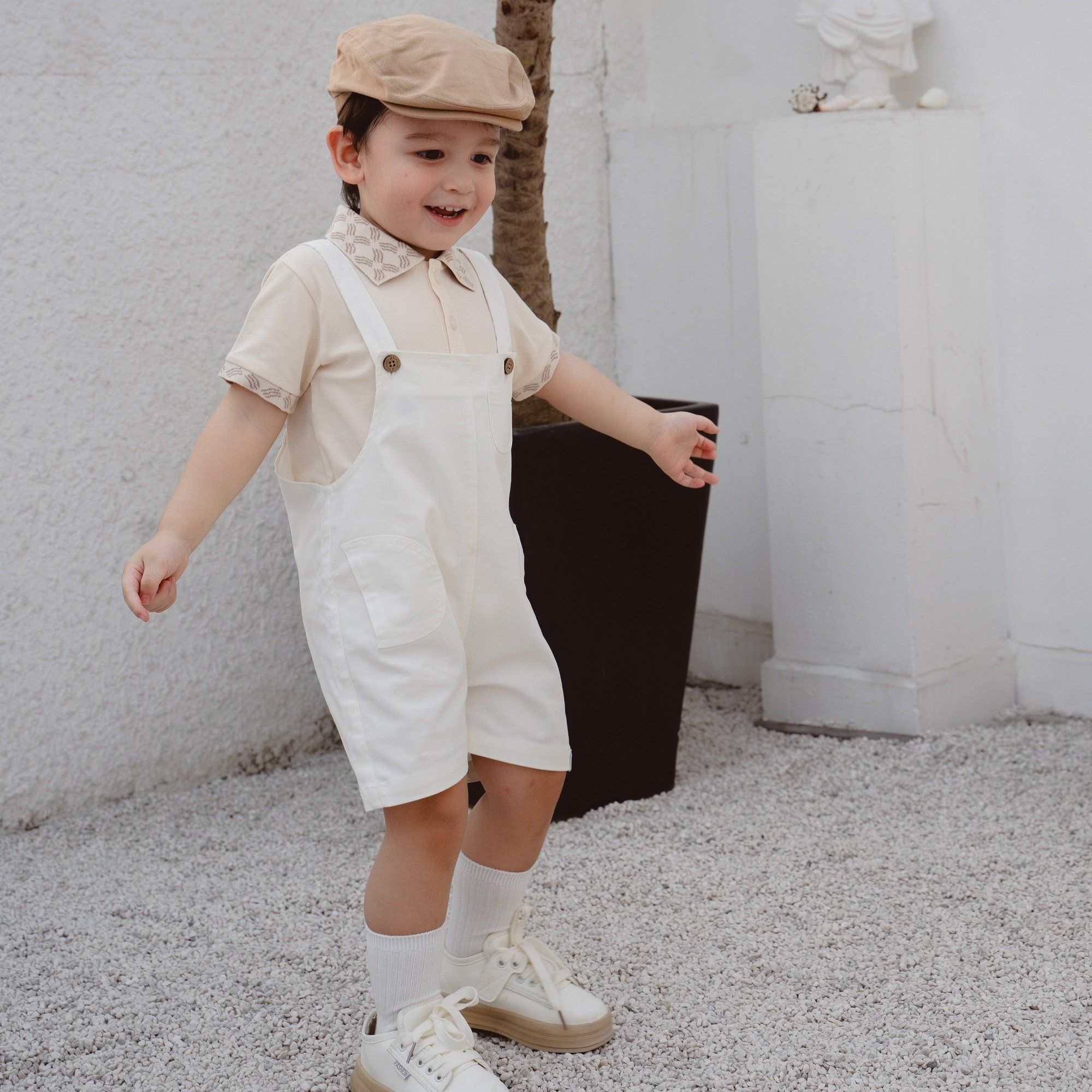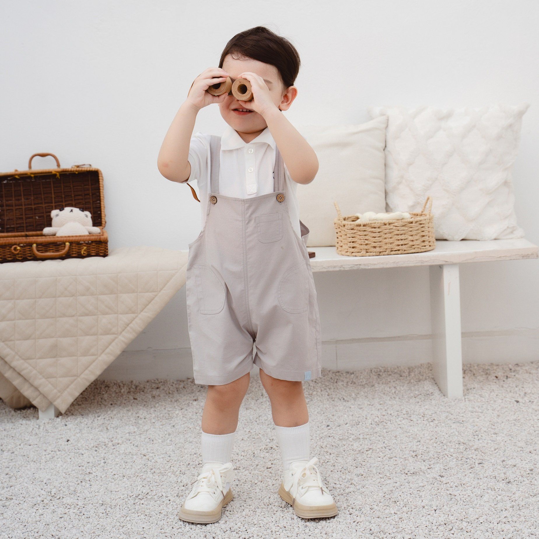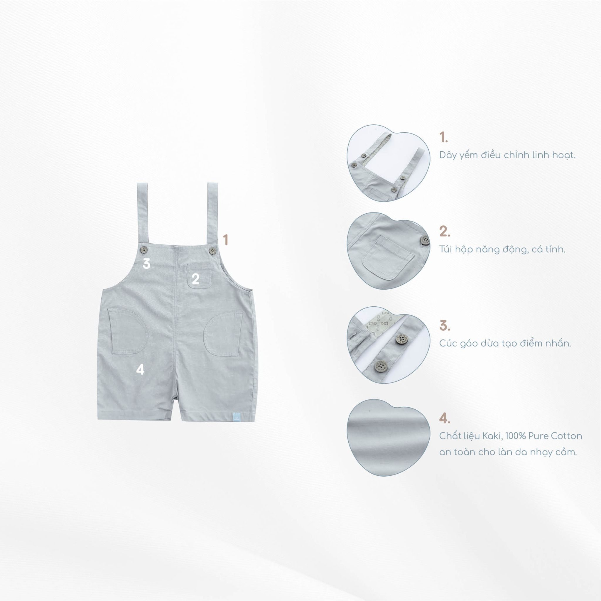 Quần yếm bé trai với thiết kế dây yếm điều chỉnh linh hoạt cùng túi hộp năng động, cá tính. Cúc gáo dừa tạo điểm nhấn. Chất liệu Kaki, 100% Pure Cotton an toàn cho làn da nhạy cảm.