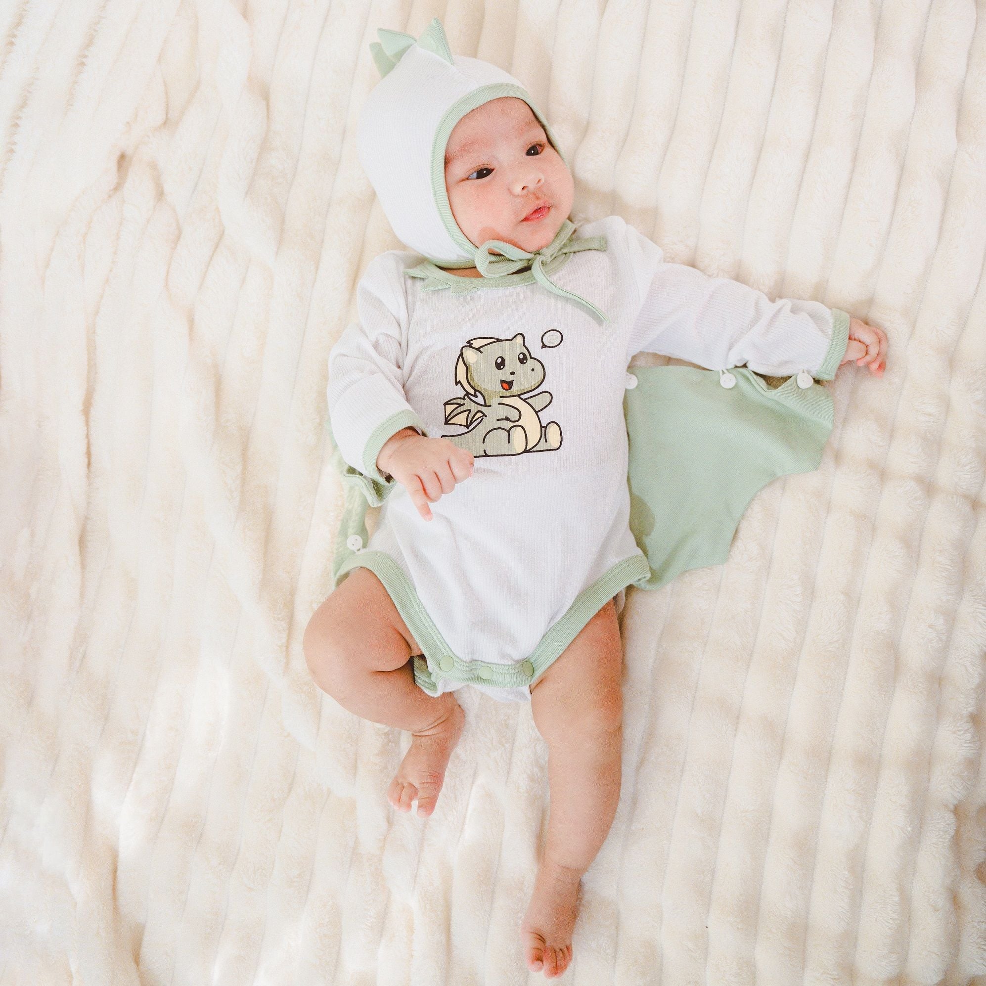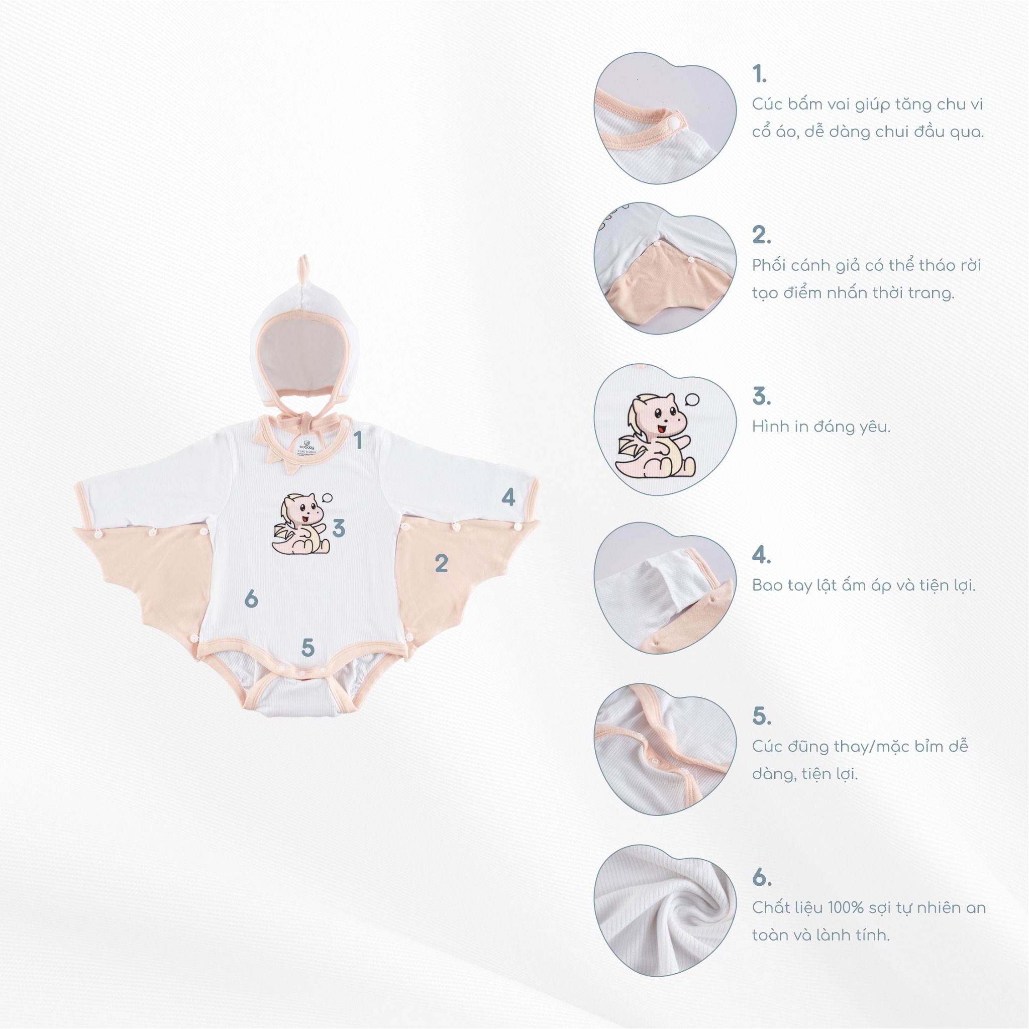 Set Body chip dài tay cài vai kèm mũ Little Dragon với cúc bấm vai giúp tăng chu vi cổ áo, dễ dàng chui đầu qua. Phối cánh giả có thể tháo rời tạo điểm nhấn thời trang. Hình in đáng yêu. Bao tay lật ấm áp và tiện lợi. Cúc đũng thay/mặc bỉm dễ dàng, tiện lợi. Chất liệu 100% sợi tự nhiên an toàn và lành tính.