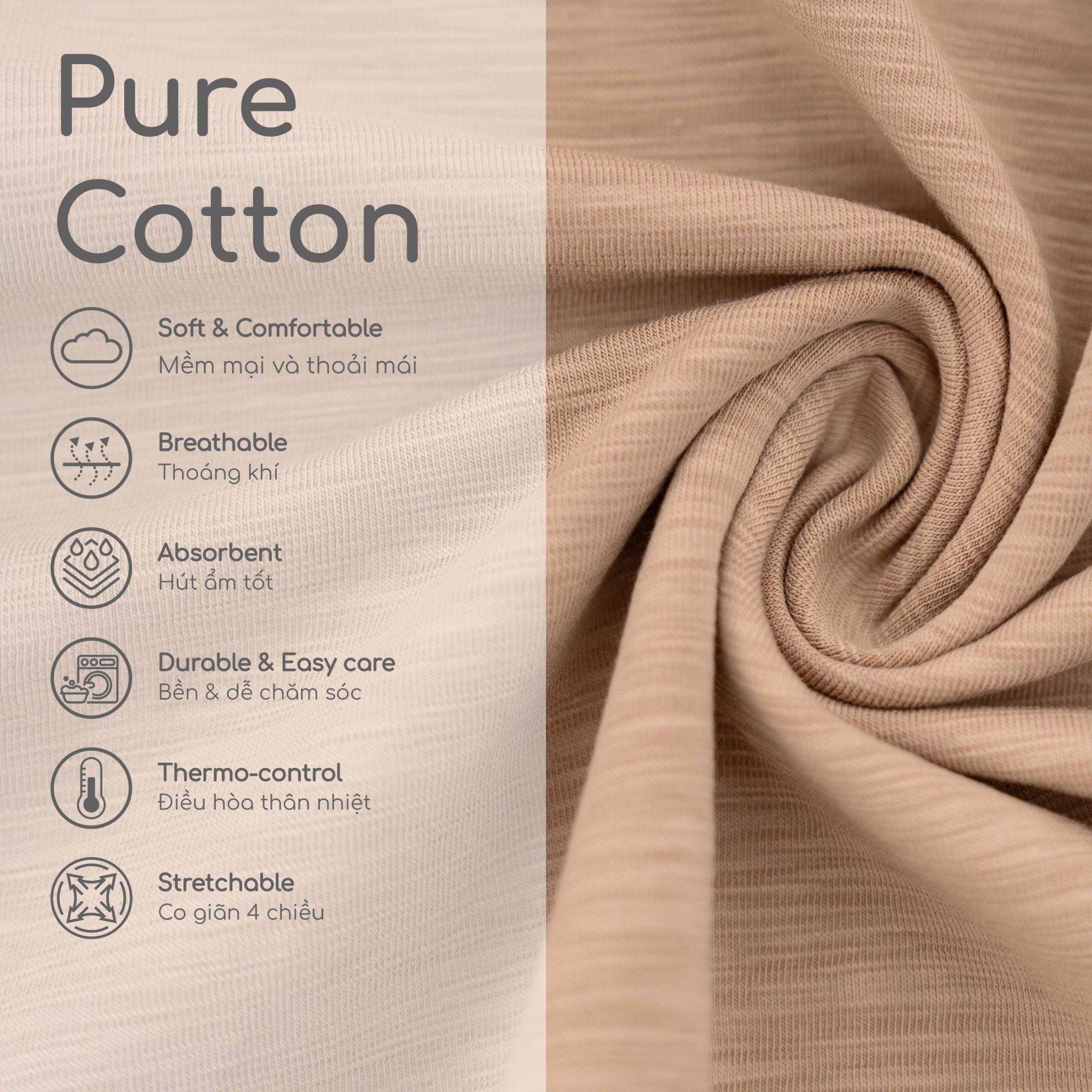Bông hữu cơ mịn, mềm và chắc. Đây là loại vải lý tưởng cho làn da nhạy cảm của em bé vì nó được trồng và xử lý mà không sử dụng hóa chất độc hại. Bông trồng thông thường là một trong những loại cây trồng có sức tàn phá lớn nhất trên thế giới hiện nay, trong khi trồng bông hữu cơ giúp làm sạch không khí, nước và đất. Bông hữu cơ không gây nguy hiểm cho động vật hoang dã hoặc sức khỏe con người. Vì vậy, bạn có thể yên tâm rằng bạn đang nhận được sản phẩm tinh khiết nhất, đảm bảo một khởi đầu khỏe mạnh cho con bạn.